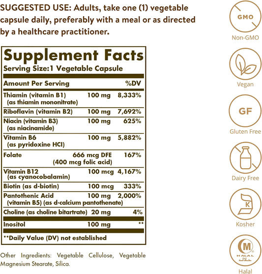 Solgar B-Complex"100", 100 cápsulas vegetales – Salud del corazón – Apoyo del sistema nervioso