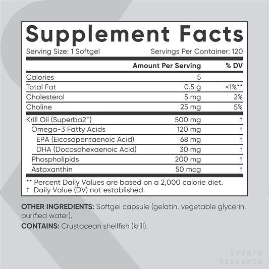 Sports Research Aceite de krill con EPA y DHA Omega 3, fosfolípidos y astaxantina del krill antártico, 500 mg, 120 cápsulas de gel blandas