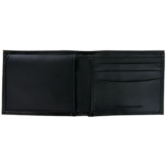Billetera Tommy Hilfiger negro tres pliegues, con placa en forma de escudo