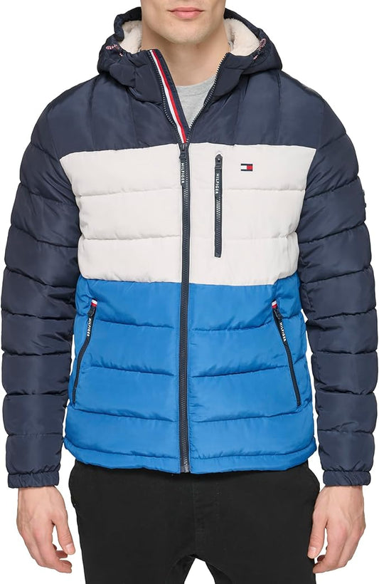Tommy Hilfiger Chaqueta acolchada resistente al agua con capucha y forro sherpa de peso medio para hombre, Hilfiger Azul