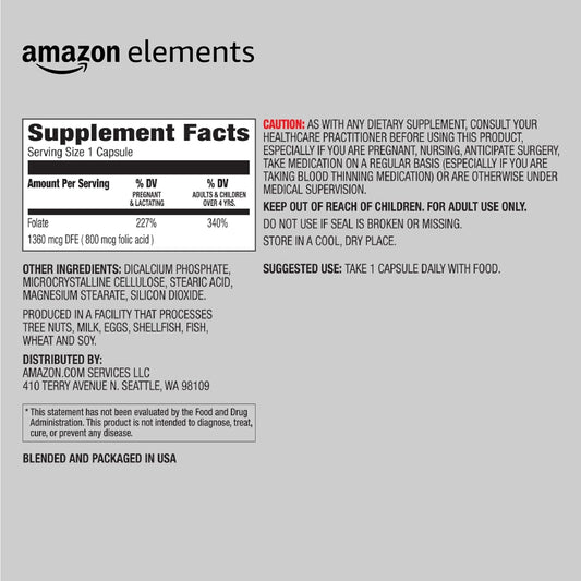 Amazon Elements Ácido fólico 800 mcg por porción, tableta, 180 unidades