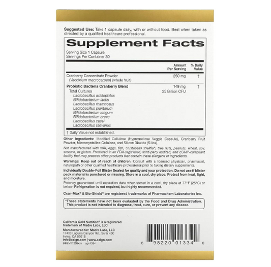 LactoBif Probiotics, Cran-Max, 25 mil millones de UFC - 30 capsulas
