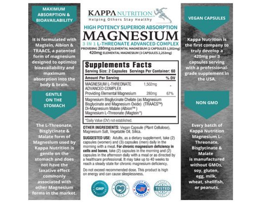 Magnesio 3 en 1 - L-Threonate advanced complex, 120capsulas- Kappa Nutrition