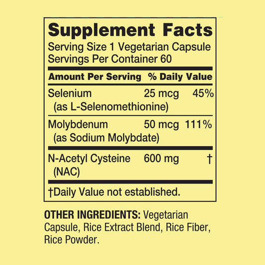 NAC N-Acetyl Cysteine Spring Valley 60 Capsules Vegetarianas, 600mg.