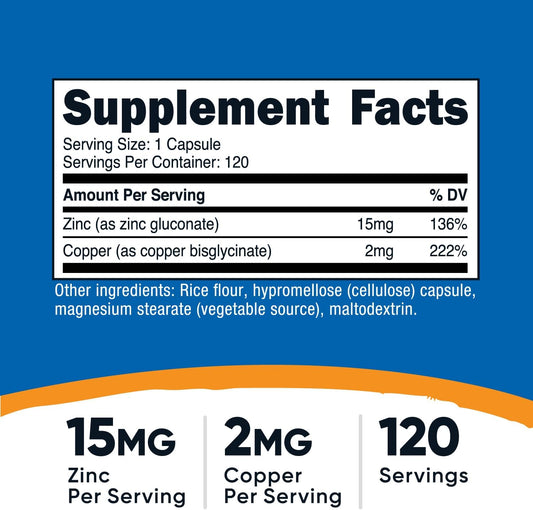 Nutricost - Zinc(15mg) + Copper(2mg), 120 capsulas