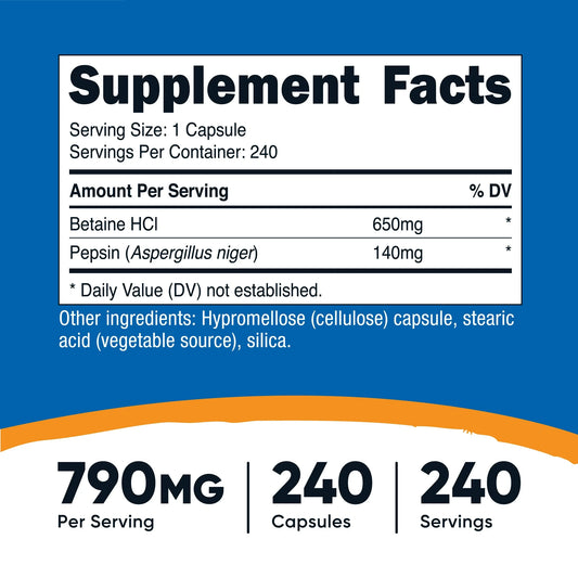 Nutricost Betaína HCl + Pepsina 790 mg, 240 cápsulas - Sin gluten y sin OMG