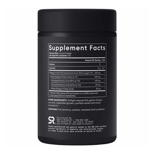 Omega 3 Sports Research - Fish Oil 1250mg - 1055 mg. Omega 3 1055 mg - Triple Accion - 150 Cápsulas Blandas