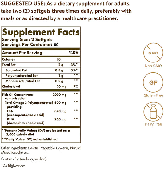 Omega 3 Fish Oil Solgar 2000mg. Aceite de Pescado Concentrado - 120 Cápsulas de Gel