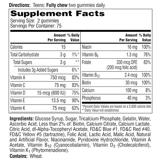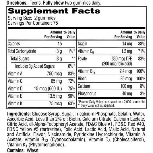 One A Day Teen para Mujeres Adolecentes con Vitaminas A, C, E, B3, B6, B12, D+Calcio 150 Gomitas