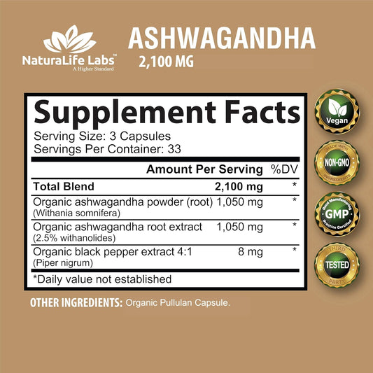 Organic Ashwagandha 2100 mg 100 cápsulas de vegetarianas