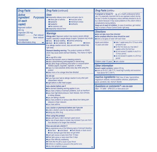 Aleve Naproxen Sodium alivia temporalmente dolores y molestias leves debido a: dolor leve de artritis, dolores musculares, dolor de espalda, cólicos menstruales, dolor de cabeza, dolor de muelas y resfriado común