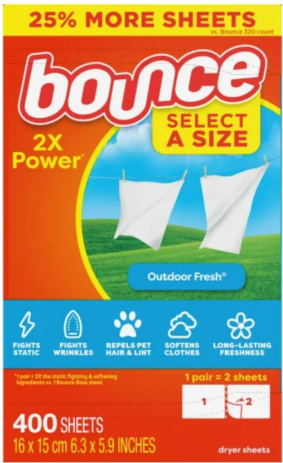 Bounce Suavizante de telas para secadora, aroma fresco al aire libre, 400 unidades