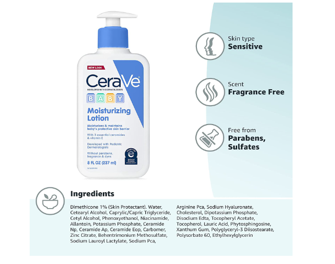- Desarrollado con dermatólogos pediátricos y sin desagradables: la loción hidratante CeraVe Baby está libre de fragancia, parabenos, tintes y ftalatos para ser suave con la delicada piel del bebé y ayuda a mantener la barrera protectora de la piel del bebé