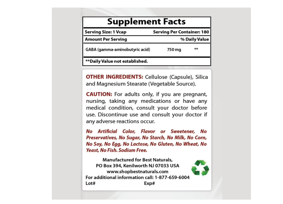- 750 mg de Gaba por cápsula vegetariana - 180 cápsulas por botella.