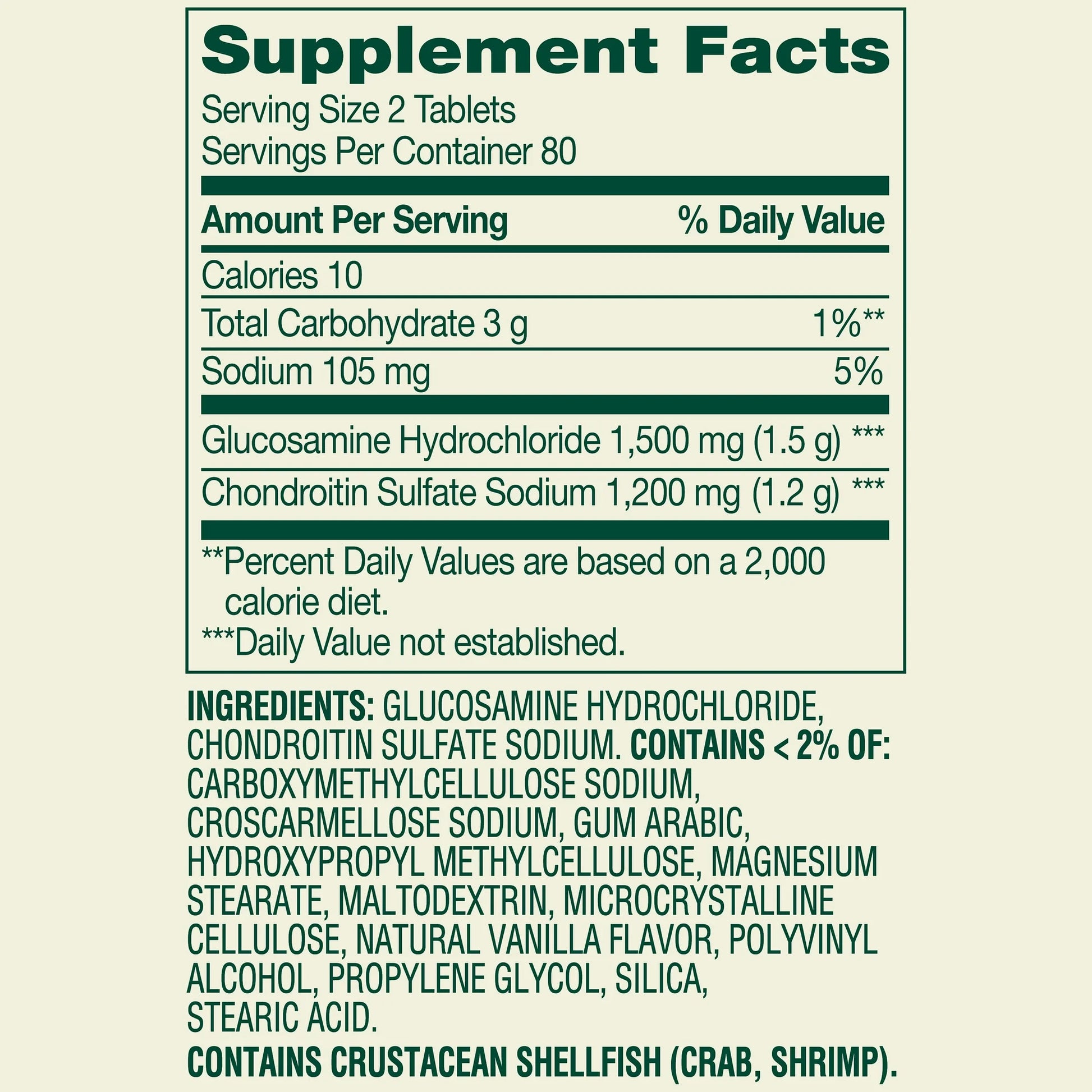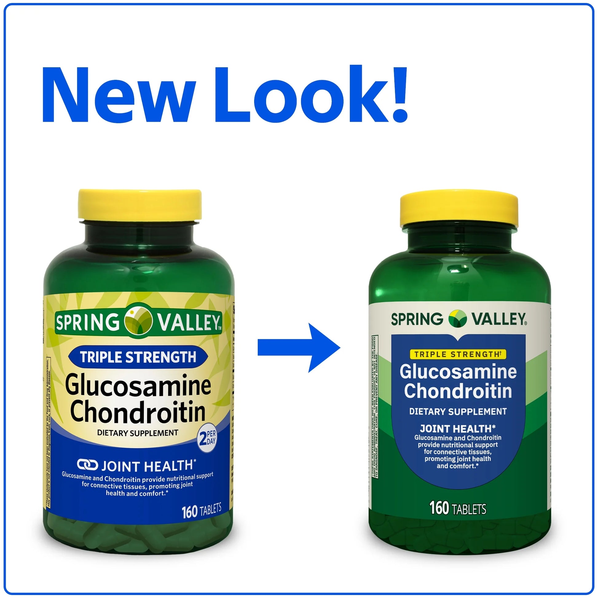 Spring Valley Glucosamine Chondroitin Dietary Supplement, está diseñado para brindar apoyo a la salud de las articulaciones. La glucosamina y la condroitina brindan soporte nutricional para los tejidos conectivos, promoviendo la salud y la comodidad de las articulaciones. La dosis sugerida para adultos es de dos tabletas al día, preferiblemente con una comida. Estas tabletas están libres de gluten, colores o sabores artificiales, azúcares y lactosa. Puede estar seguro de que Spring Valley Glucosamine Chondroitin Dietary Supplement Twin Pack se produce con estrictas pautas de calidad y está respaldado por nuestra garantía de calidad.