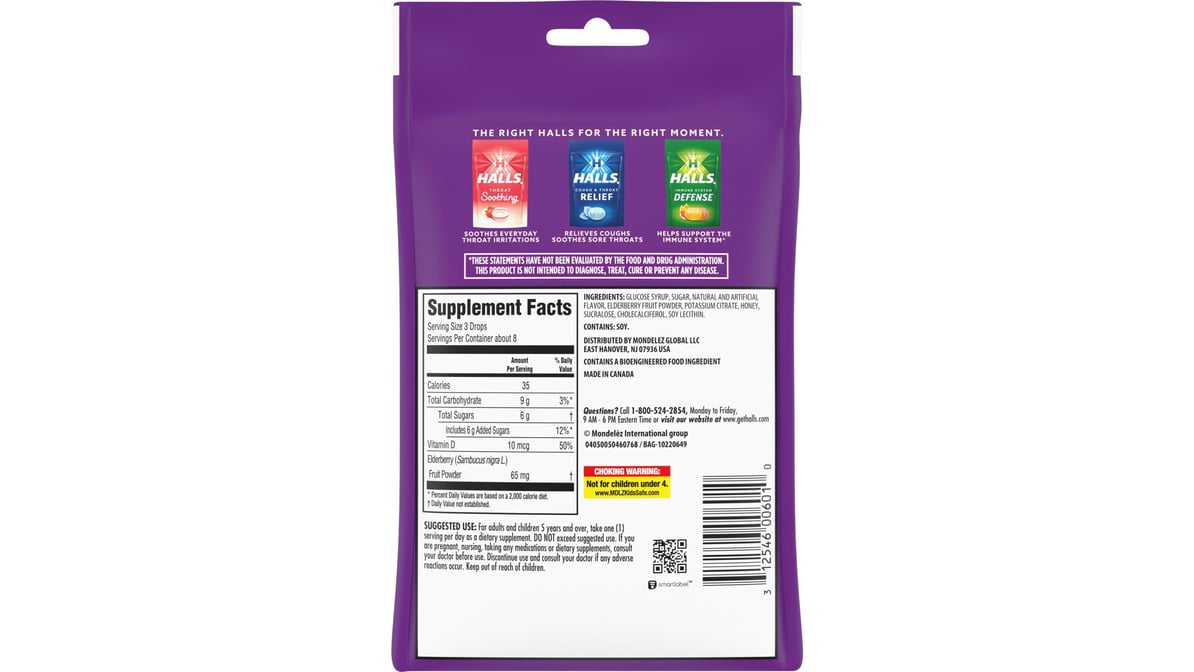Las pastillas para la tos de saúco HALLS para aliviar la tos y la garganta y reforzar el sistema inmunológico están listas para lo que la vida te depare o para lo que la tos te depare. Estas pastillas para la garganta, que contienen el 50 por ciento del valor diario de vitamina D por porción y están hechas con saúco real, ayudan a eliminar la mucosidad, calmar la tos, refrescar los conductos nasales y también tienen el beneficio adicional de apoyar la salud del sistema inmunológico. Con un agradable y refrescante sabor a saúco, las pastillas para la tos de saúco HALLS para aliviar la tos y la garganta y reforzar el sistema inmunológico son suplementos dietéticos formulados para adultos y niños mayores de cinco años. Ya sea que uses las pastillas para la tos de HALLS para aliviar la garganta seca o reforzar el sistema inmunológico, simplemente disuelve una gota en tu boca lentamente; no excedas las 3 gotas por día. Cada bolsa resellable contiene 25 gotas envueltas individualmente, perfectas para llevar en tu bolsillo o bolso para un acceso conveniente cuando aparezcan los síntomas.