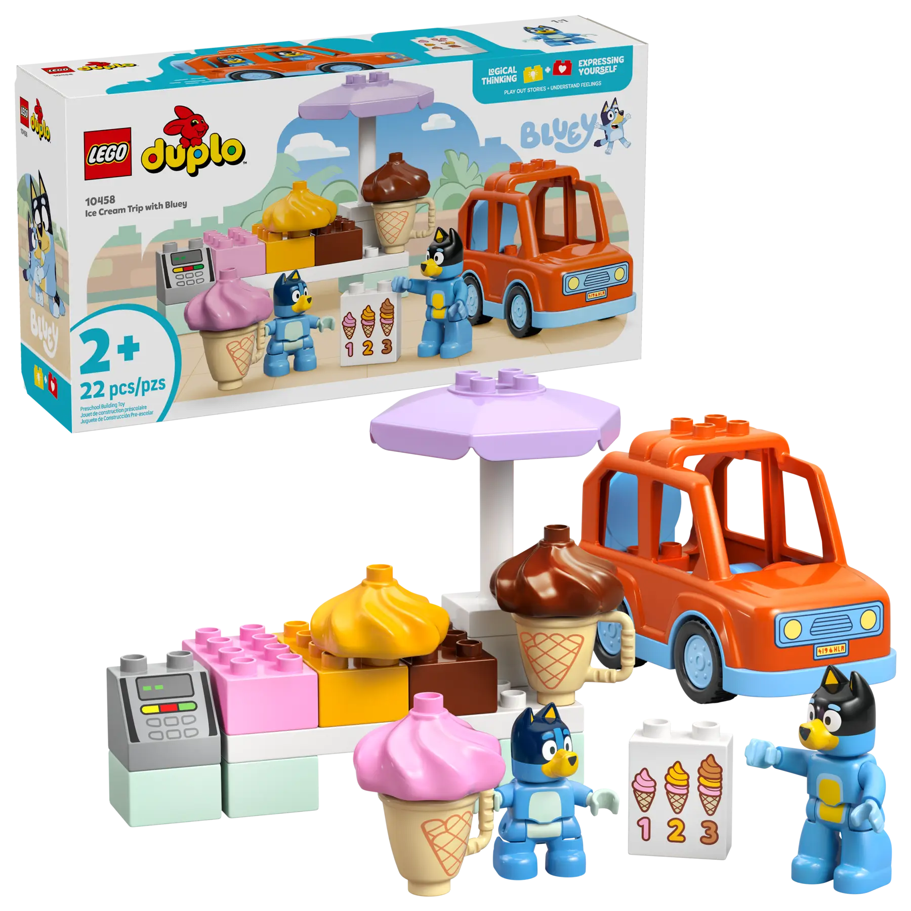 - Juego con puesto de helados y vehículo inspirado en la serie para televisión Bluey: Transporta a tu preescolar al divertido mundo de la familia Pastor con el juguete para bebés LEGO® DUPLO® Bluey Excursión a la Heladería con Bluey