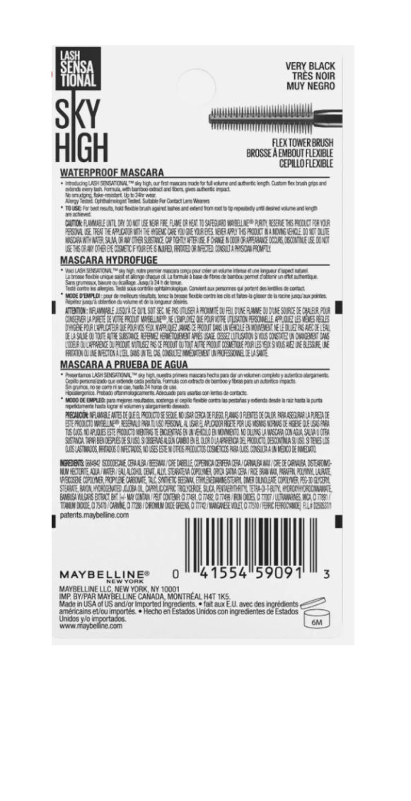 La máscara de pestañas Lash sensacional sky-high brinda un volumen completo y una longitud ilimitada. El exclusivo cepillo de rímel Flex Tower se dobla para dar volumen y extender cada pestaña desde la raíz hasta la punta. Fórmula de máscara a prueba de agua infundida con extracto de bambú y fibras para pestañas largas y llenas que nunca se apelmazan. Disponible en negro muy negro y negro pardusco. Adecuado para los ojos sensibles y usuarios de lentes de contacto. Se quita fácilmente con un desmaquillador de ojos a prueba de agua.