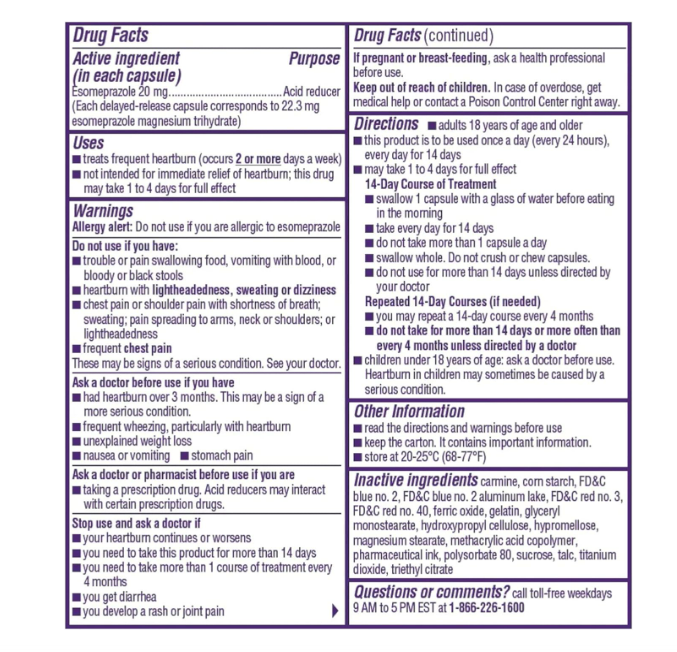 - Contenido: 42 cápsulas Nexium 24HR ClearMinis reductor de ácido, alivio de la acidez estomacal, cápsulas de liberación retardada para protección durante todo el día y toda la noche contra la acidez estomacal frecuente, medicina para la acidez estomacal con esomeprazol y magnesio proporciona una protección completa contra la acidez estomacal