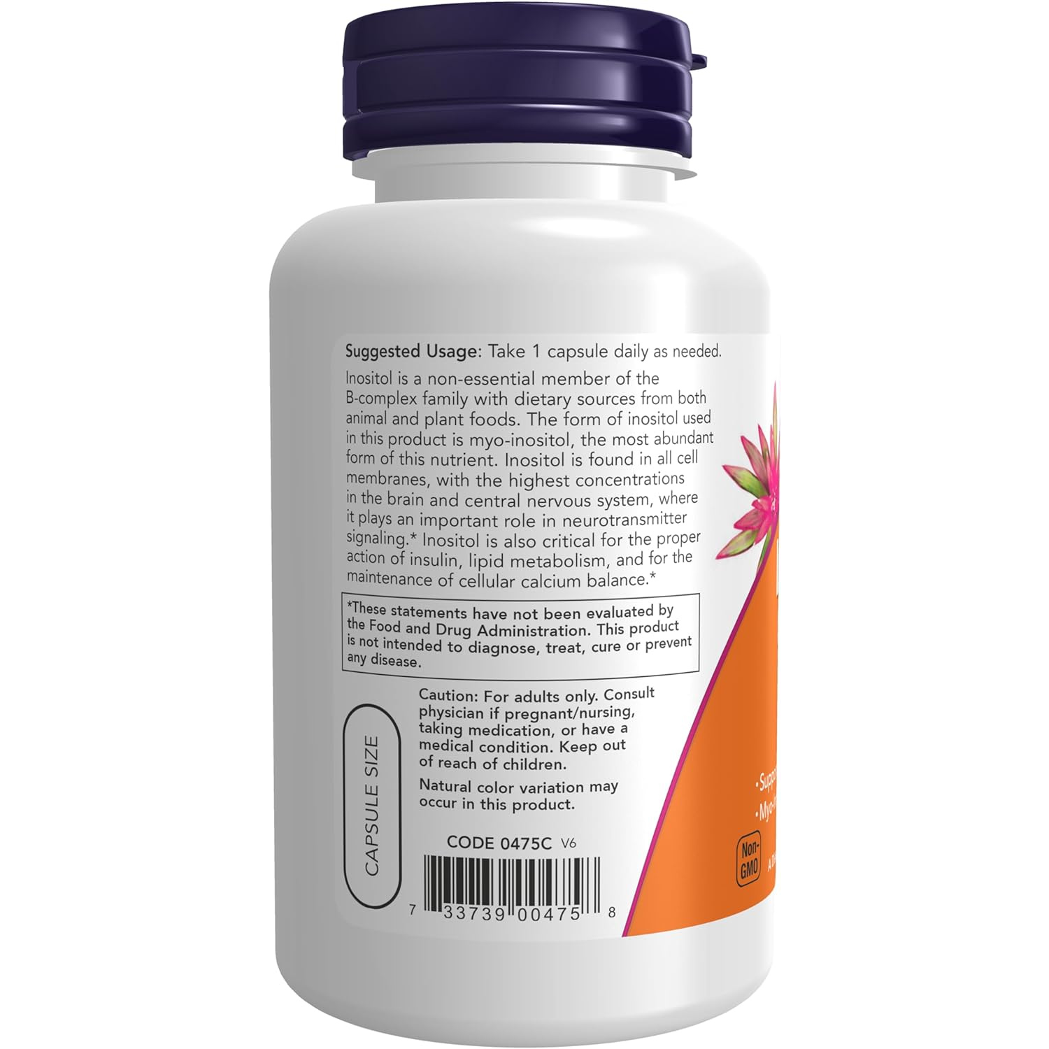 El inositol es un miembro no esencial de la familia del complejo B con fuentes dietéticas tanto de alimentos animales como vegetales. La forma de inositol utilizada en este producto es mioinositol, la forma más abundante de este nutriente. El inositol se encuentra en todas las membranas celulares, con las concentraciones más altas en el cerebro y el sistema nervioso central, donde desempeña un papel importante en la señalización de los neurotransmisores. El inositol también es fundamental para la acción adecuada de la insulina, el metabolismo de los lípidos y para el mantenimiento de equilibrio de calcio celular.