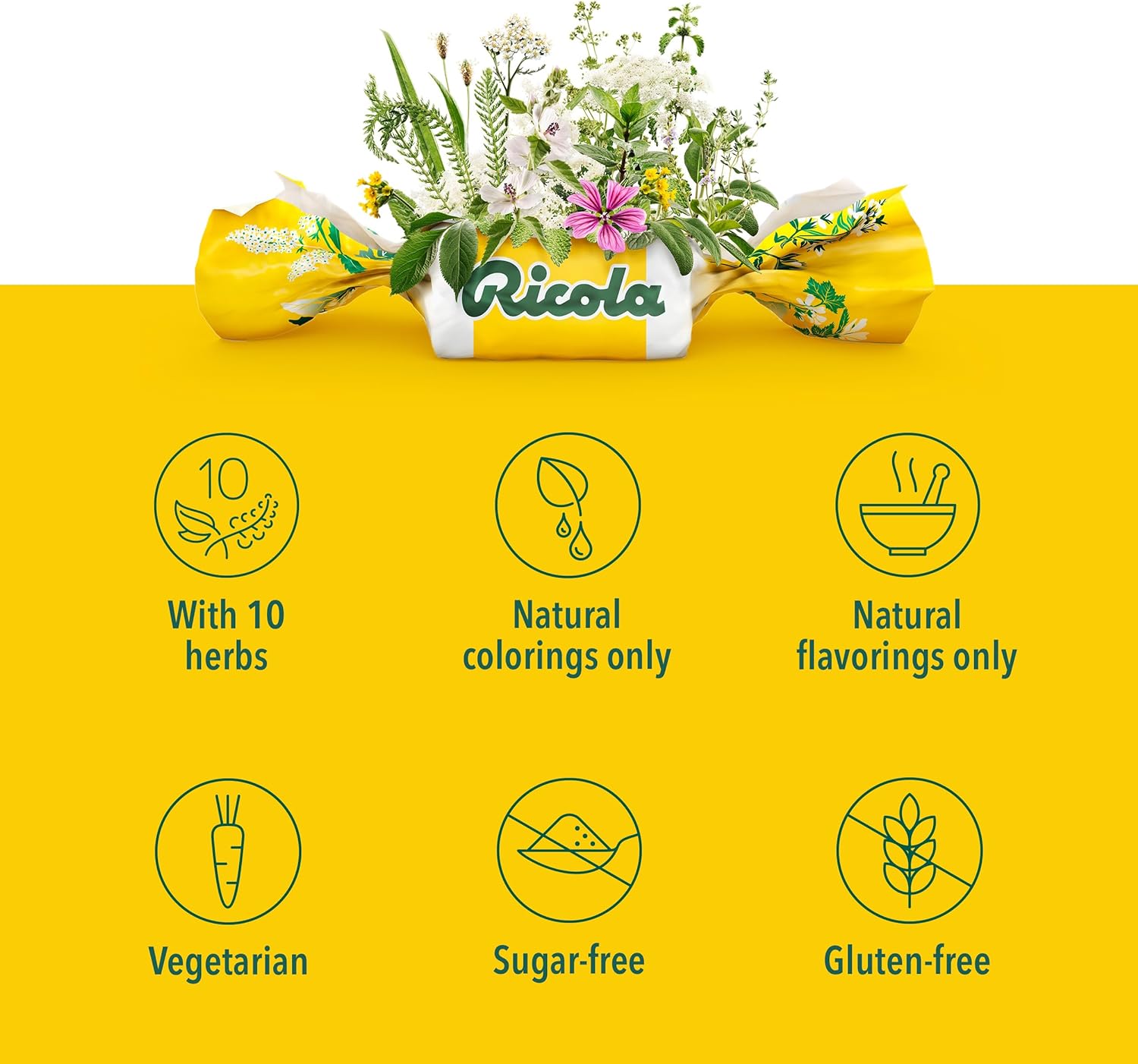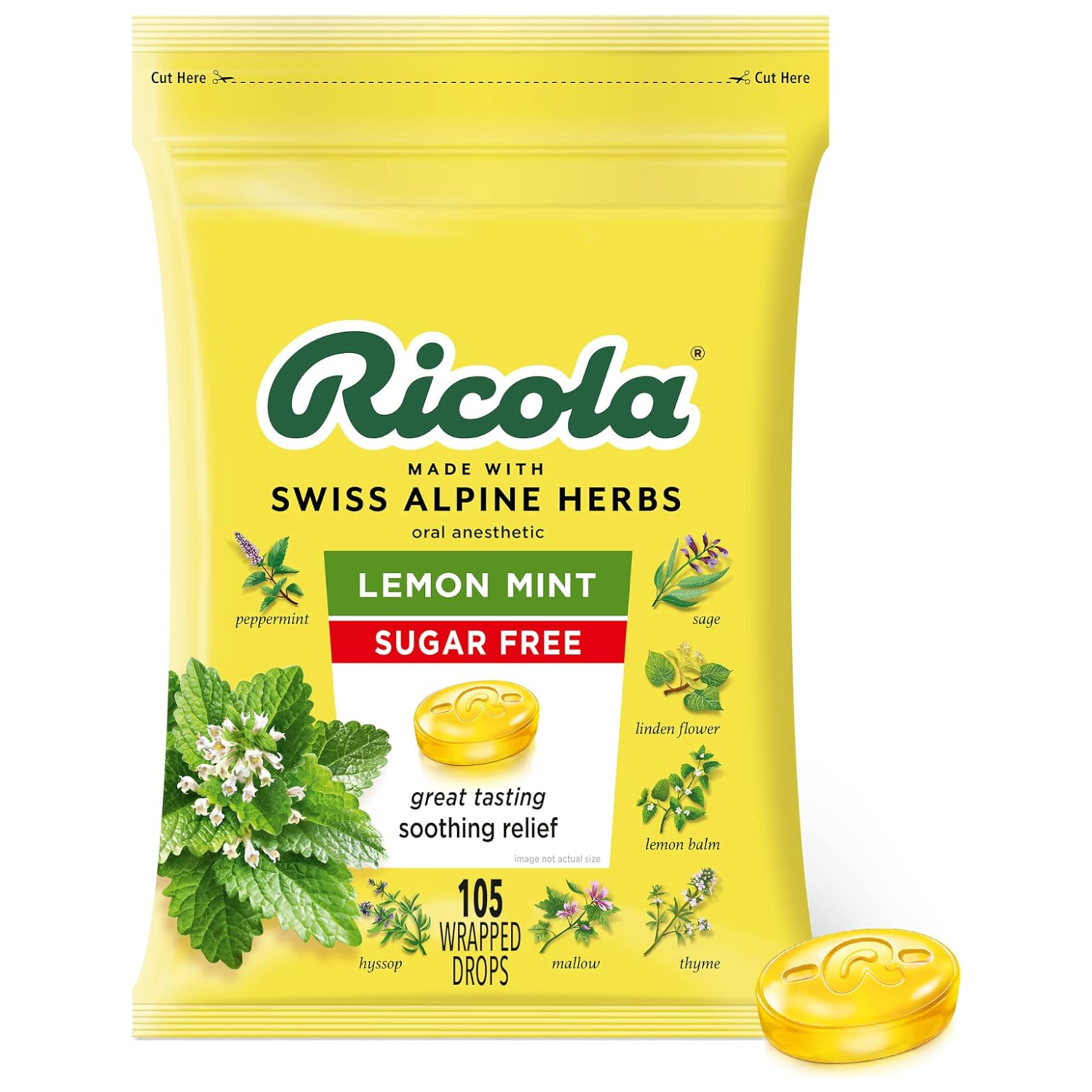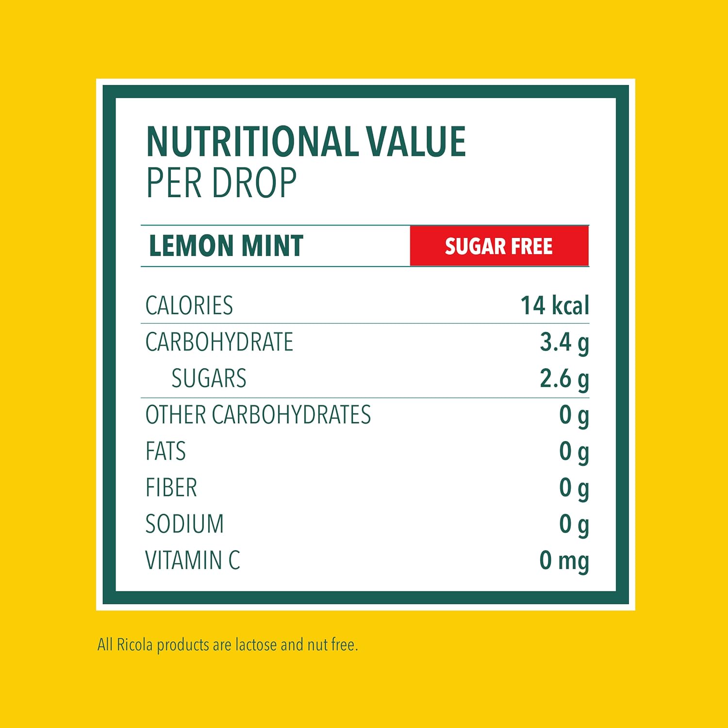 - RICOLA Gotas de garganta de menta y limón sin azúcar: las gotas de garganta de menta y limón Ricola combinan limón refrescante y menta con mentol relajante, saborizadas por la deliciosa mezcla de hierbas alpinas suizas de Ricola. Una pastilla sin azúcar que es calmante, eficaz y agradable. Ingrediente activo (en cada gota): mentol, 1,5 mg (también disponible con azúcar en nuestro paquete variado)
