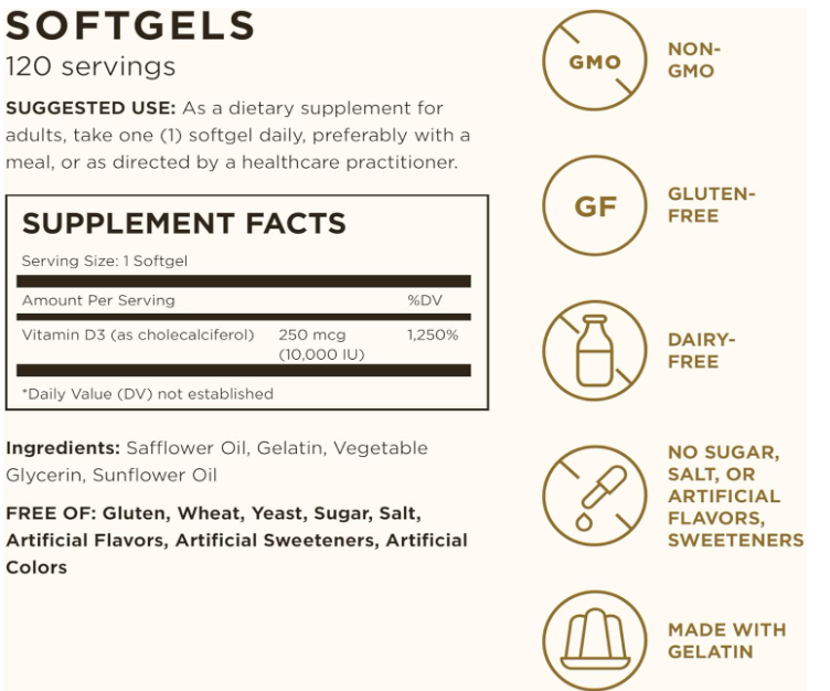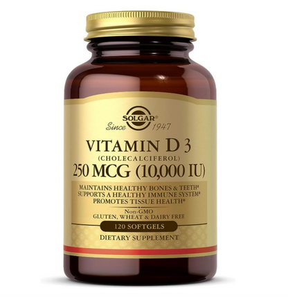 - Apoya tu sistema inmunológico: Solgar Vitamina D3 (colecalciferol) de 250 mcg (10,000 UI) en cápsulas blandas apoya un sistema inmunológico saludable y la función neuromuscular.