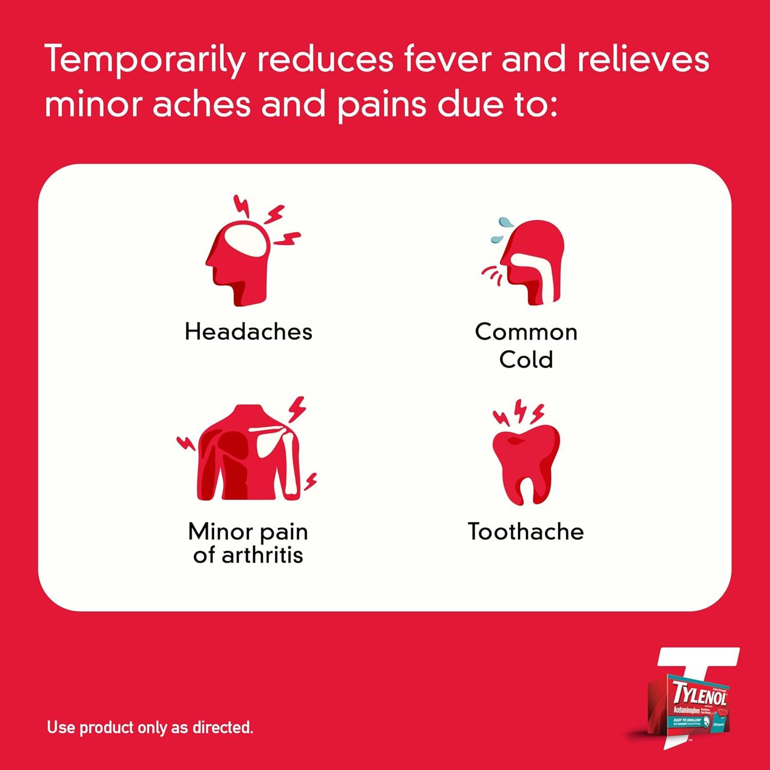 Reduce temporalmente la fiebre y alivia dolores y molestias leves con las Cápsulas Recubiertas de Acetaminofén Tylenol Extra Fuerte y Fáciles de Tragar para adultos. Este analgésico extrafuerte y fácil de tragar cuenta con la tecnología de recubrimiento Gentleglide*, que facilita su deglución. Este recubrimiento especializado proporciona una mejor experiencia para quienes tienen disfagia o tienen dificultad para tomar pastillas, cápsulas o tabletas. Cada cápsula recubierta extrafuerte contiene 500 miligramos de acetaminofén, un analgésico y reductor de fiebre de confianza. De la marca número 1 recomendada por médicos para el alivio del dolor y la reducción de la fiebre, estas cápsulas recubiertas para aliviar el dolor brindan un alivio rápido de dolores y molestias leves causados por dolor de cabeza, dolor de espalda, dolor de muelas, dolor de artritis y resfriado común. Los adultos y niños mayores de 12 años deben tomar dos cápsulas fáciles de tragar cada seis horas mientras duren los síntomas. El recubrimiento Gentleglide es más fácil de tragar que las cápsulas Tylenol Extra Strength regulares, según la preferencia.