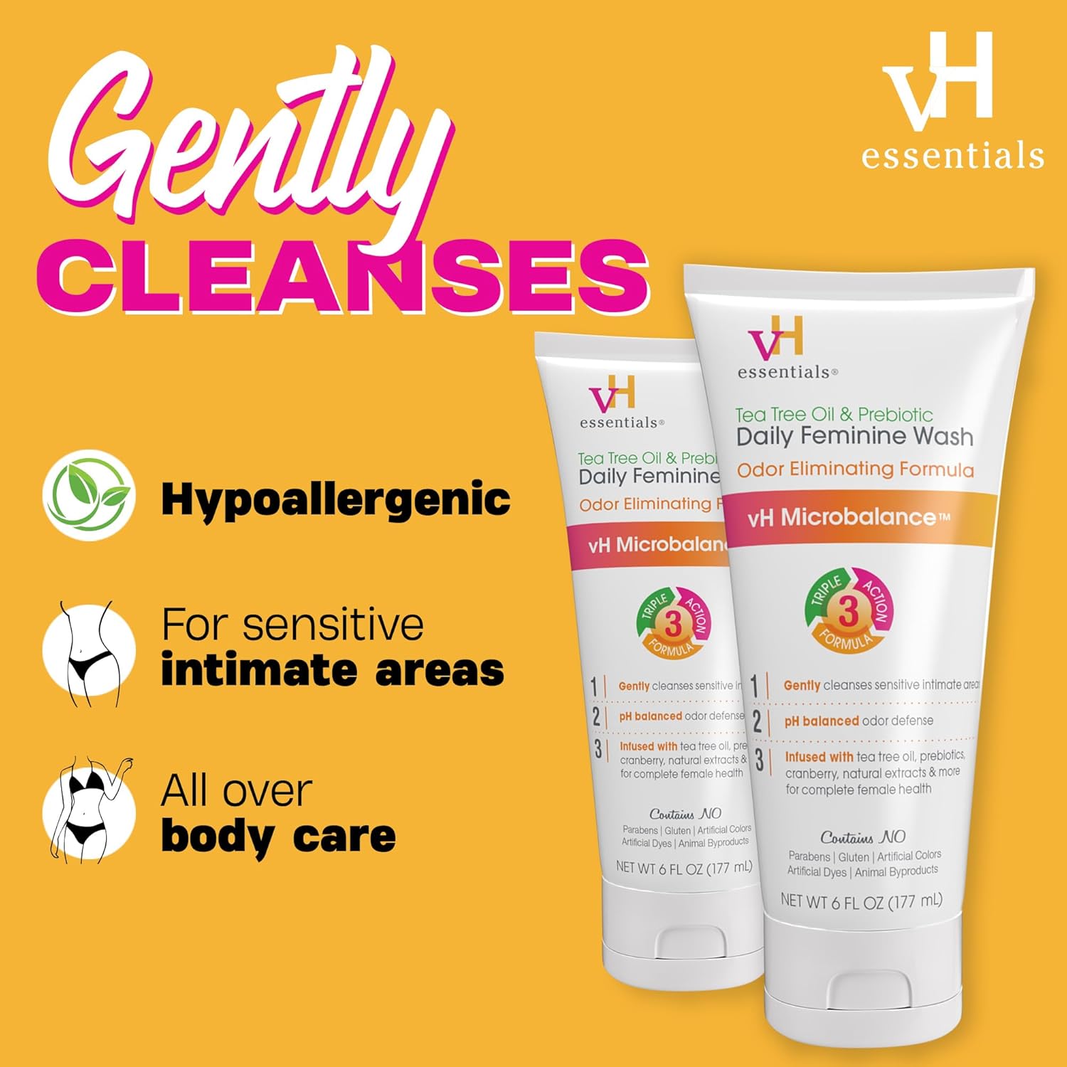 - Defensa contra el olor vaginal de vH Microbalance: los prebióticos ayudan a nutrir bacterias buenas que apoyan la flora vaginal fresca, mientras que el aceite de árbol de té proporciona protección natural contra las bacterias que causan olores, sin ingredientes agresivos