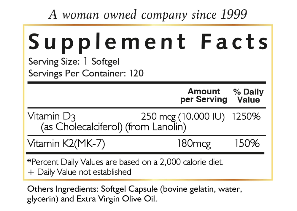 - Apoya la salud de los huesos y los dientes: las vitaminas D3 y K2 funcionan mejor juntas para la salud ósea